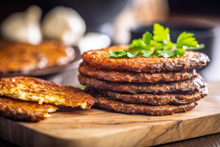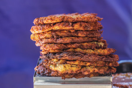 Freshly fried crunchy golden latkes, traditional food