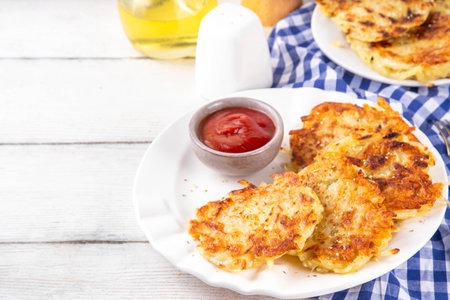 Potato cakes. Vegetable fritters, pancakes, latkes - dish consisting of pan fried shredded potatoes. View from above, top view, copy space