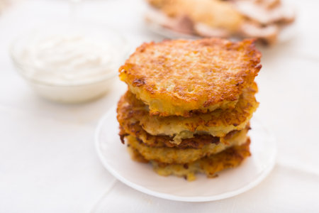Potato Pancake. Draniki Dish with Sour Cream. Vegetable Fritter Baked for Vegetarian Kitchen German Cooking. Jewish latkes or Deruny. Grated and Fried Flapjacks for Breakfast. Homemade Recipie