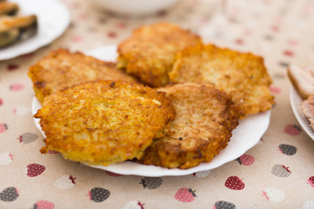 Fried grated potatoes pancakes served on the plate.