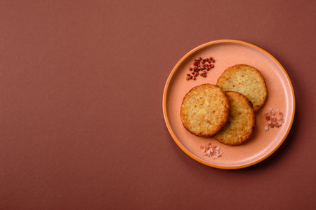 Delicious crispy pancakes made from potatoes, meat, carrots, onions with salt, spices and herbs on a dark concrete background