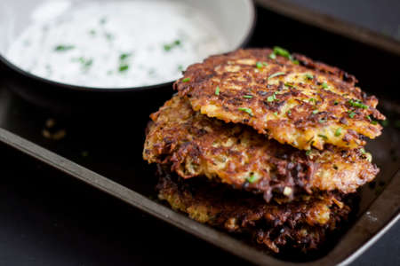 potato pancakes with sour cream and chives on a dark background