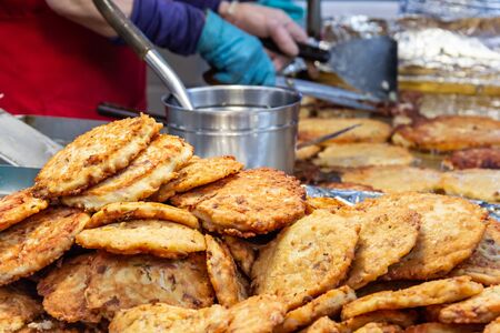 Street food cooked in a pan at the market. Baked potatoes until golden brown. Food specialties.