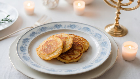 AI Generated. Traditional table setting with blue and silver decorations plate of golden potato pancakes and glowing menorah