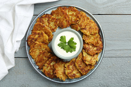 Delicious potato pancakes and sour cream on gray wooden table, top view