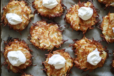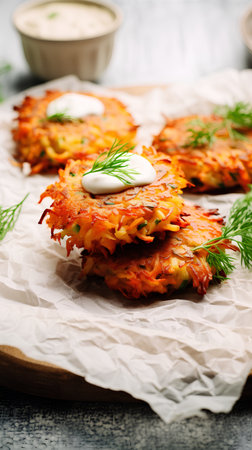 Crispy potato latkes with sour cream on parchment paper - delicious homemade snack.