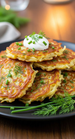 potato pancakes with sour cream and dill on a dark background