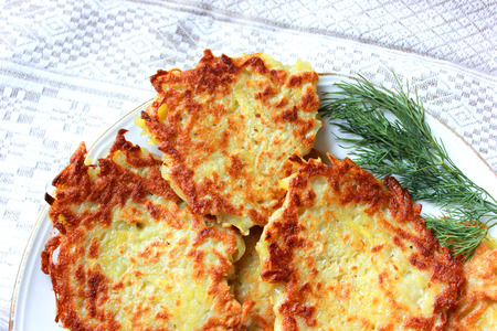 Toasted potato pancakes with dill on a white background