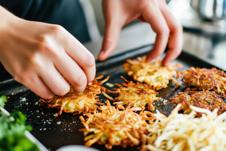 Close up of chef's hands arranging perfectly golden hash browns on a black pan