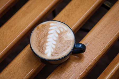 Sideway shop coffee, a cup of hot latte art coffee on the table.