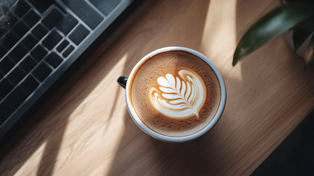 Latte with artful milk patterns, shot from above, set on a natural wood table with warm lighting, exuding a relaxed coffeehouse vibe.