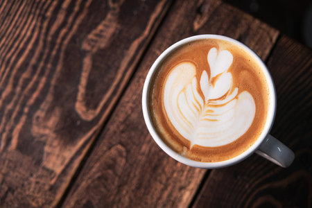 Cup of cappuccino with latte art on wooden background. Flat lay style.