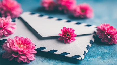 Close-up image of a white envelope adorned with pink flowers, creating a delicate and romantic aesthetic. The envelope has a patterned design, and the flowers are placed gently around it on a light blue surface.