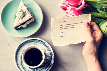 Hand Holding Message Note Paper with Bakery and Coffee Cup