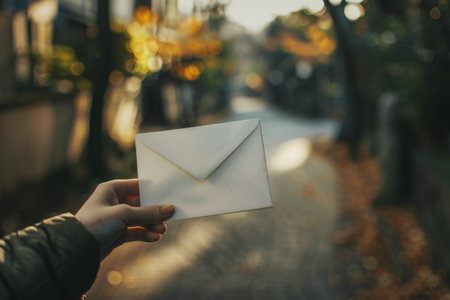 A person stands holding a white envelope in their hand. The envelope is crisp and clean, contrasting against the persons skin. The individuals fingers are delicately wrapped around the envelope, suggesting importance or anticipation.