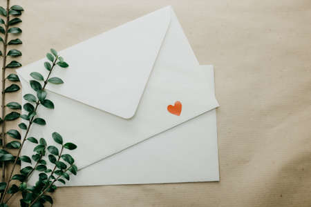 Minimal composition with a white envelope, heart and green leaves. craft for a st valentine. correspondence and newsletter