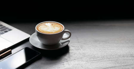 Focus on white coffe cup with latte art coffee and laptop, mobile phone on desk, Dark tone
