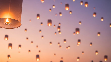 A breathtaking scene featuring glowing lanterns drifting into the night sky just after sunset, creating a magical and peaceful atmosphere.
