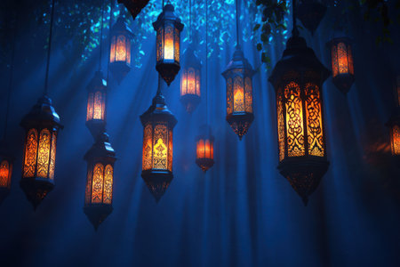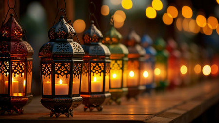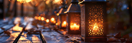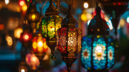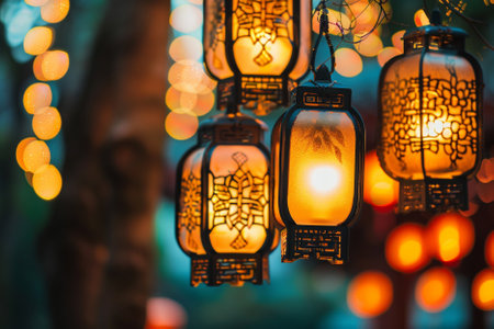 Arabesque lanterns suspended in the night, their intricate patterns casting a soft glow amidst the bokeh light dance