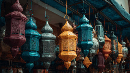 A vibrant display of hanging lanterns in various colors and intricate designs, showcasing traditional Middle Eastern craftsmanship and decorative items for sale in a bustling market stall.