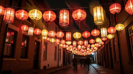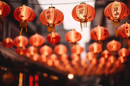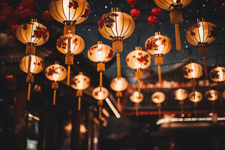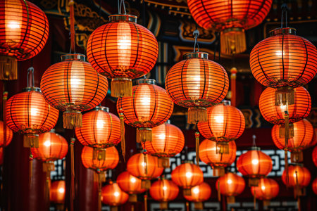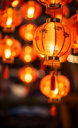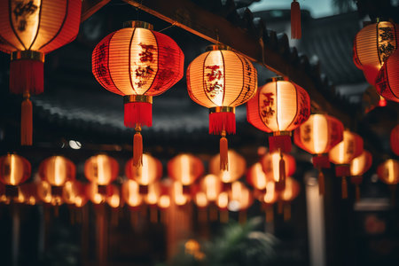 Vibrant red chinese lanterns glowing brightly against a dark, festive background, celebrating cultural traditions and holiday cheer