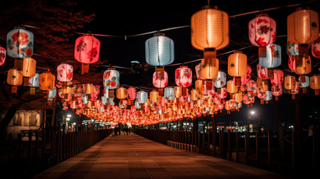 Vibrant Asian Festival Celebration with Illuminated Paper Lanterns and a Glowing Cityscape at Night