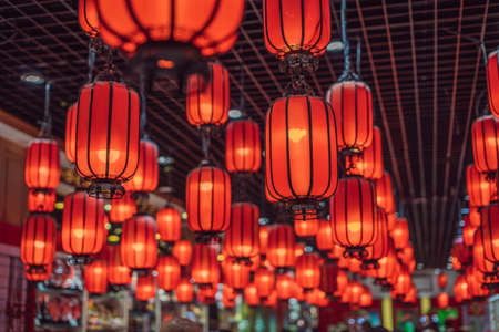 Group of red chinese lanterns illuminated at night for the chinese new year
