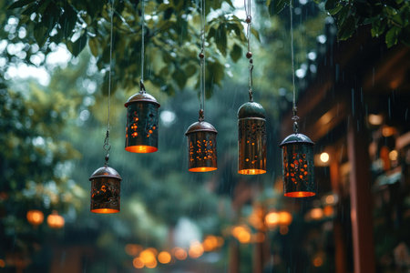 Decorative lanterns are hanging from tree branches, illuminating a rainy evening in a garden