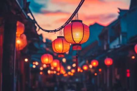 Chinese lanterns hanging in street during sunset, casting warm glow, creating festive and serene ambiance.