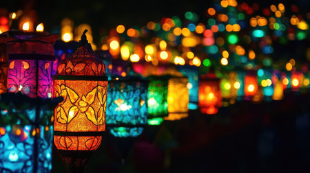A close-up of brightly colored lampion lamps hanging in a row, glowing softly against a dark background, perfect for capturing the magic of the festival