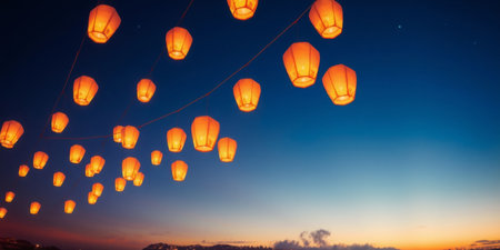 Colorful lanterns hang in the night sky during a lantern festival, creating a festive atmosphere with space for additional text.