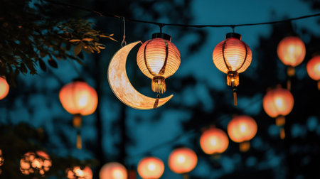 Crescent moon shining above a festival setting adorned with tiny lanterns