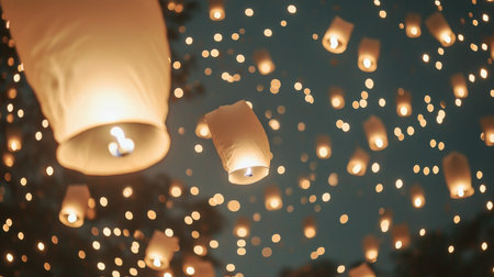 Yi Peng lanterns floating in night sky during Loi Krathong festival in Chiang Mai, background, AI Generated