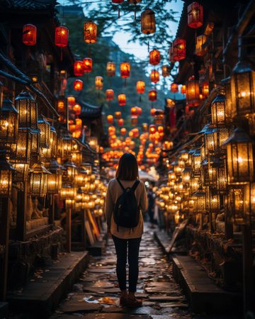 An AI generated illustration of a female standing in an urban alleyway illuminated by hanging lanterns