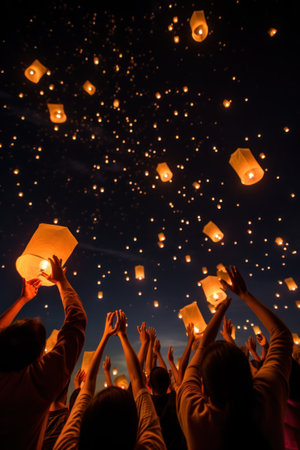 people lighting flying lanterns in night sky. ai generated