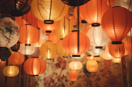 A mesmerizing view of lampion lamps illuminating the night sky at a festival, with rich colors and intricate patterns