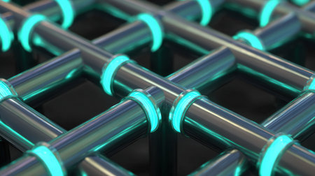 Intricate close-up view of a dark network structure with interconnected nodes and grid patterns, creating a modern and abstract representation of technology and design concepts.