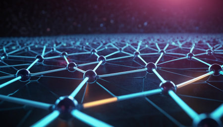 This image illustrates an abstract network of blue nodes and connecting lines against a dark background, symbolizing connectivity and advanced technology.