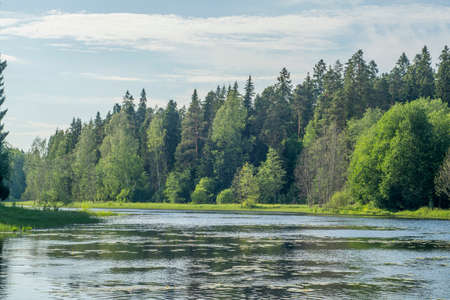 Lake in Karelia among larch trees, Russia. Beautiful autumn season landscape with river and forest stock photo