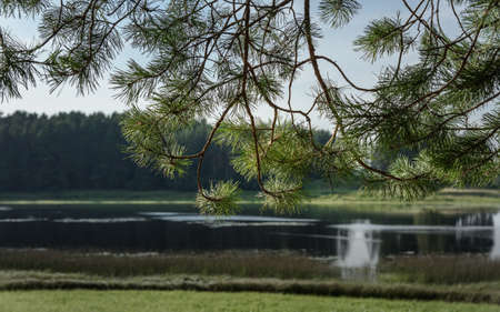 natural landscape with reflection of pine forest in a calm water of dystrophic lake in Royal Pine Nature Reserve in Poland