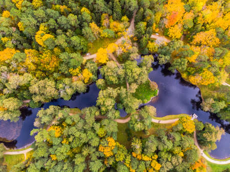 Aerial top down view of autumn forest with green and yellow trees. Mixed deciduous and coniferous forest. Beautiful fall scenery near Vilnius city, Lithuania