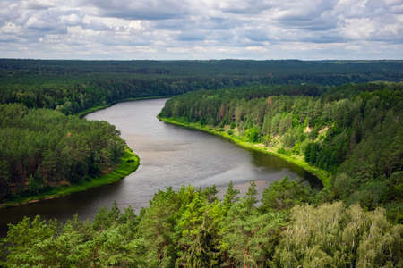 Å ventoji River in spring, Lithuania. Scenic view from a height of 21 meters on the bends of the river and the forests growing on both sides.