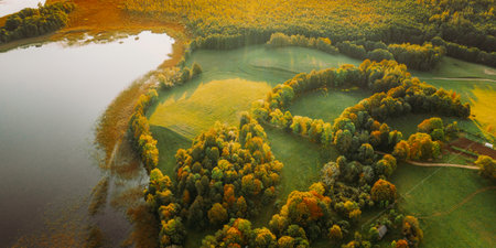 Dramatic view of winding river and autumn forest, aerial view of Poland