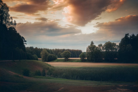 Serene sunset view over a tranquil countryside landscape with fields and trees. The sky is filled with dramatic clouds.