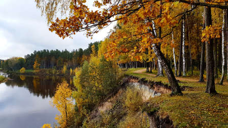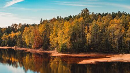 Beautiful autumn forest with colorful trees and pacturesque sky reflected in the water. Autumn nature landscape.