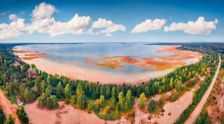 View from flying drone of Svityaz lake. Breathtaking morning scene of Shatsky National Park, Volyn region, Ukraine, Europe. Travel concept background.