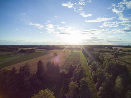 Beautiful aerial forest scene in summer. Green trees and fields on sunny summer day. City park scenery in Vilnius, Lithuania.