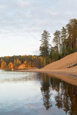 A pine forest with trees, trunks, water of a river or lake, illuminated by the summer, autumn, or spring evening sun. A beautiful natural landscape for a postcard or wallpaper