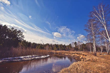 Aerial view Pripyat river in the resettlement zone in the Polessky Radiological Reserve. Ecological problem concept.