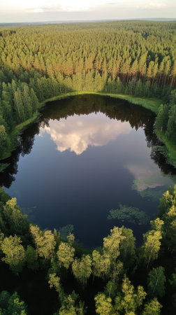 This tranquil lake is nestled amidst dense pine trees, capturing the clouds in its still waters. The peaceful atmosphere offers a perfect escape into nature's beauty during sunset.